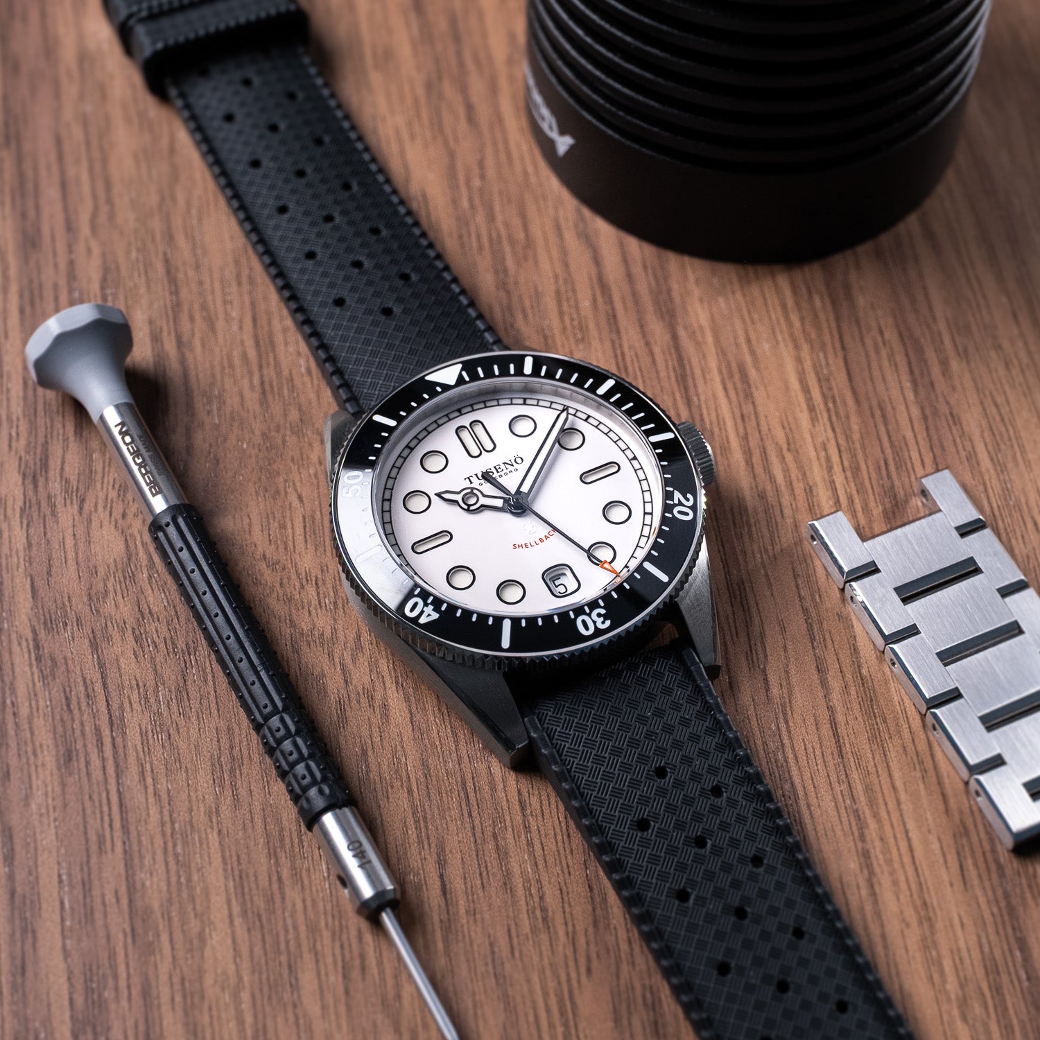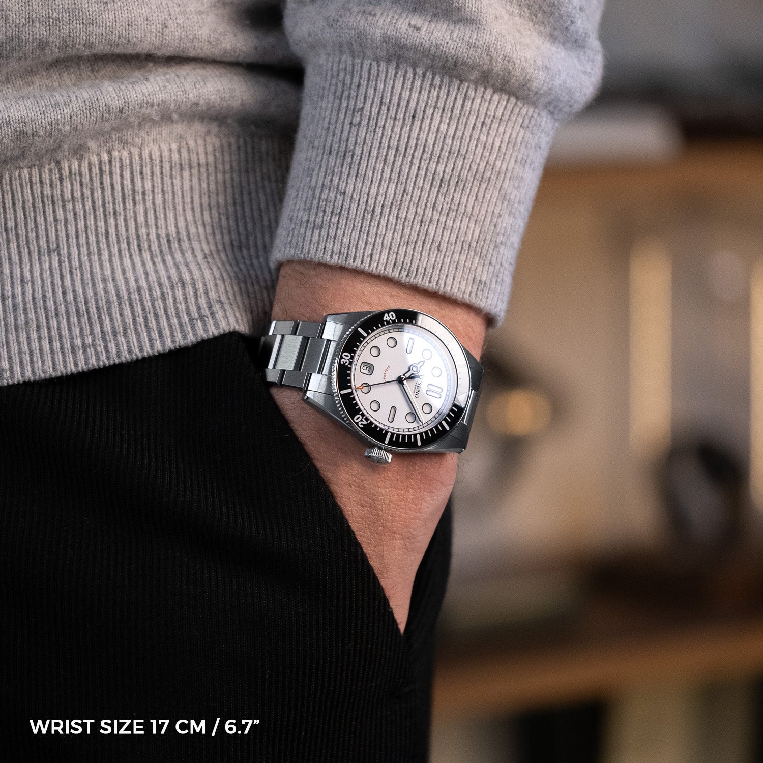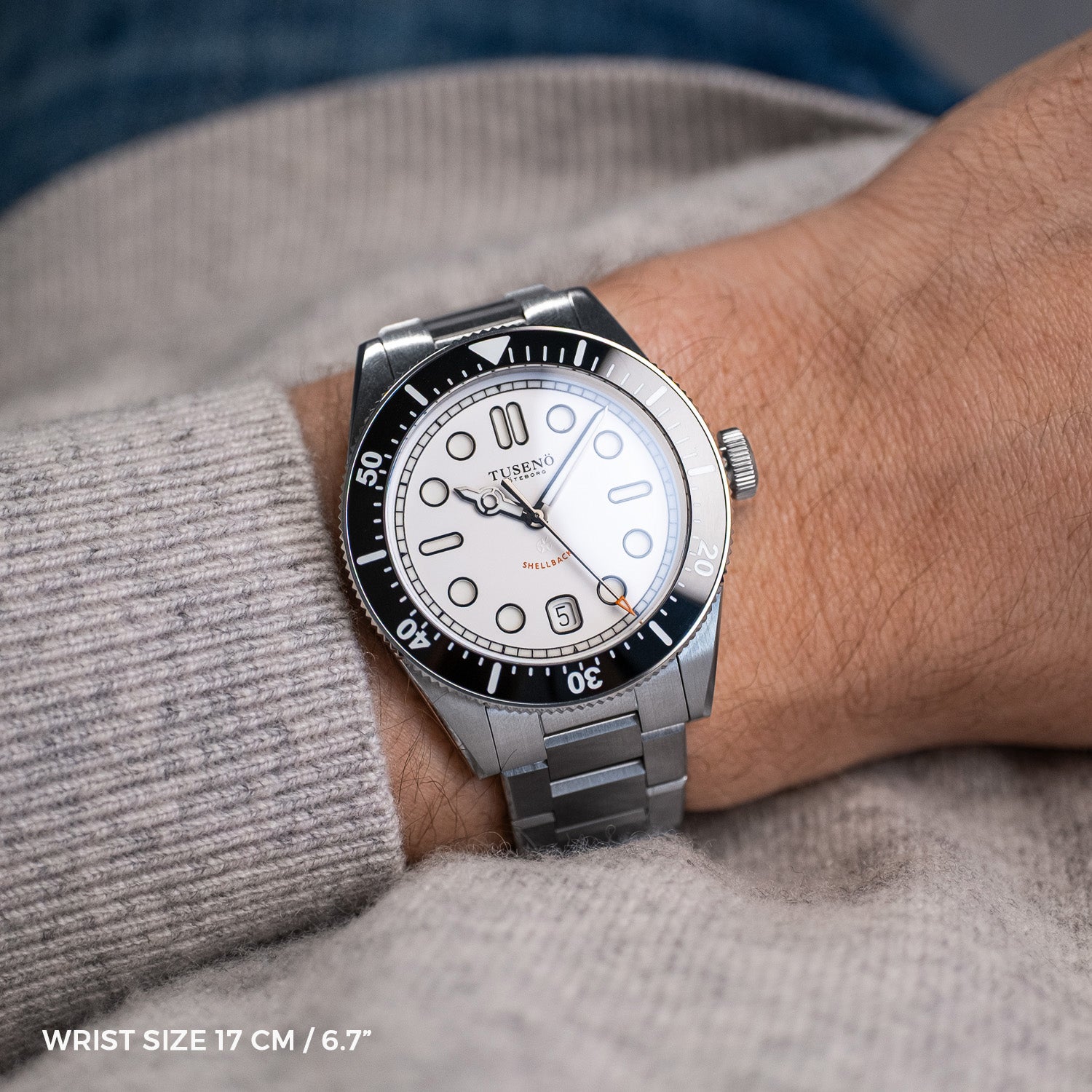 Bracelet: Flat top with diver clasp (hidden "on the fly" adjustment). Tapers from 20 mm to 18 mm.