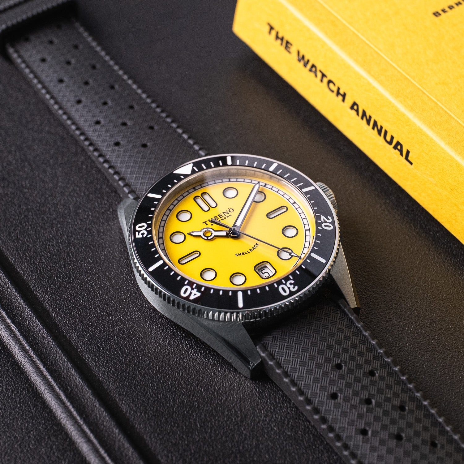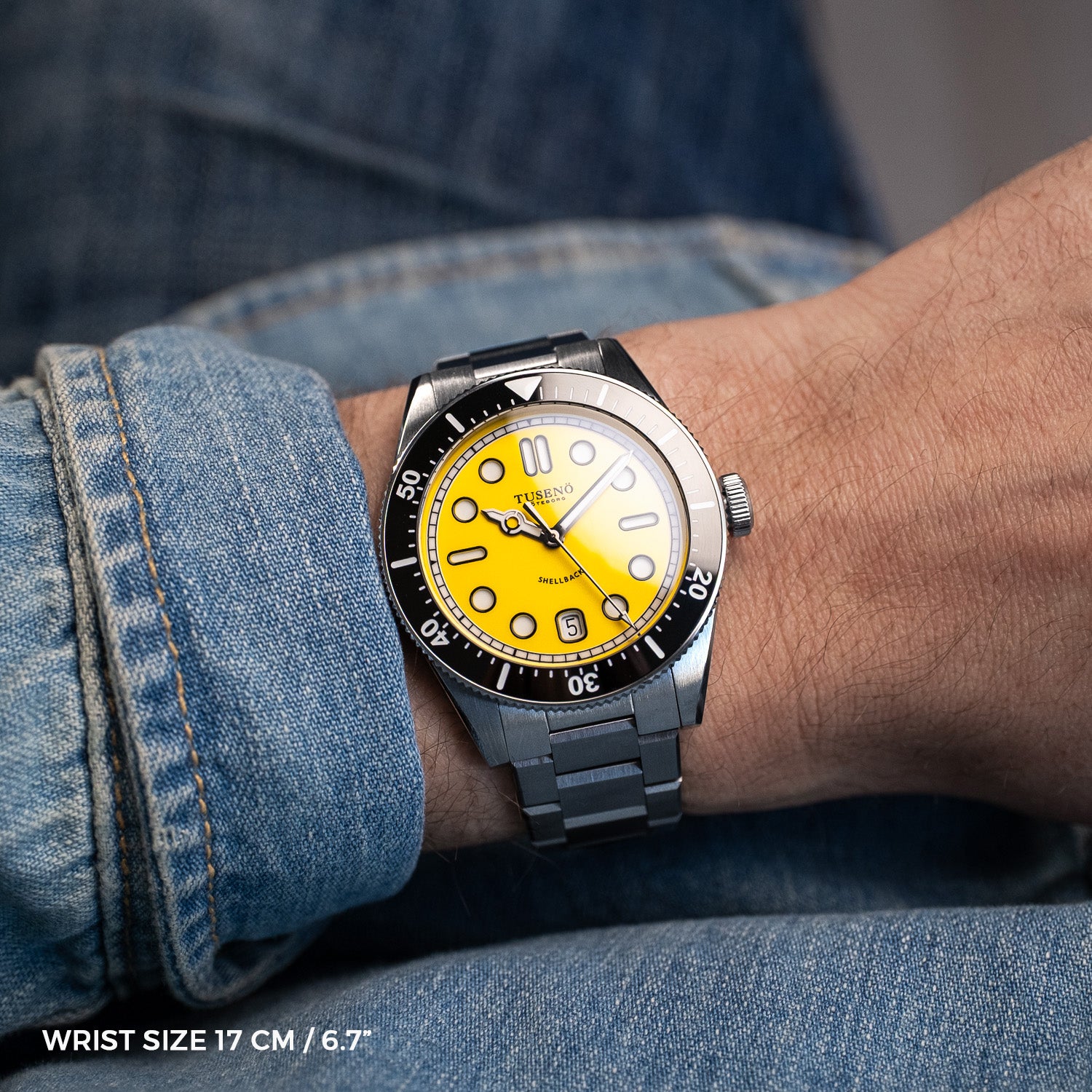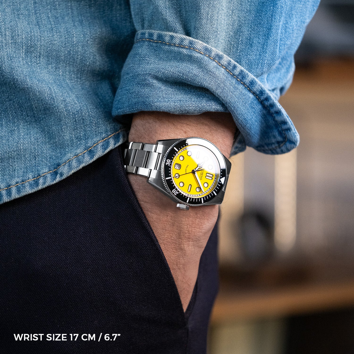 The striking yellow dial, with semi metallic finish is the star of the show, the contrasting black hands, bezel and printing matches perfectly. A bold and sporty choice.