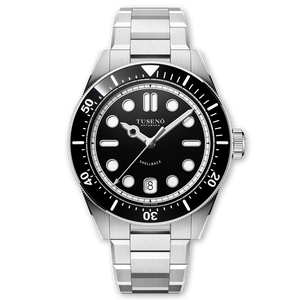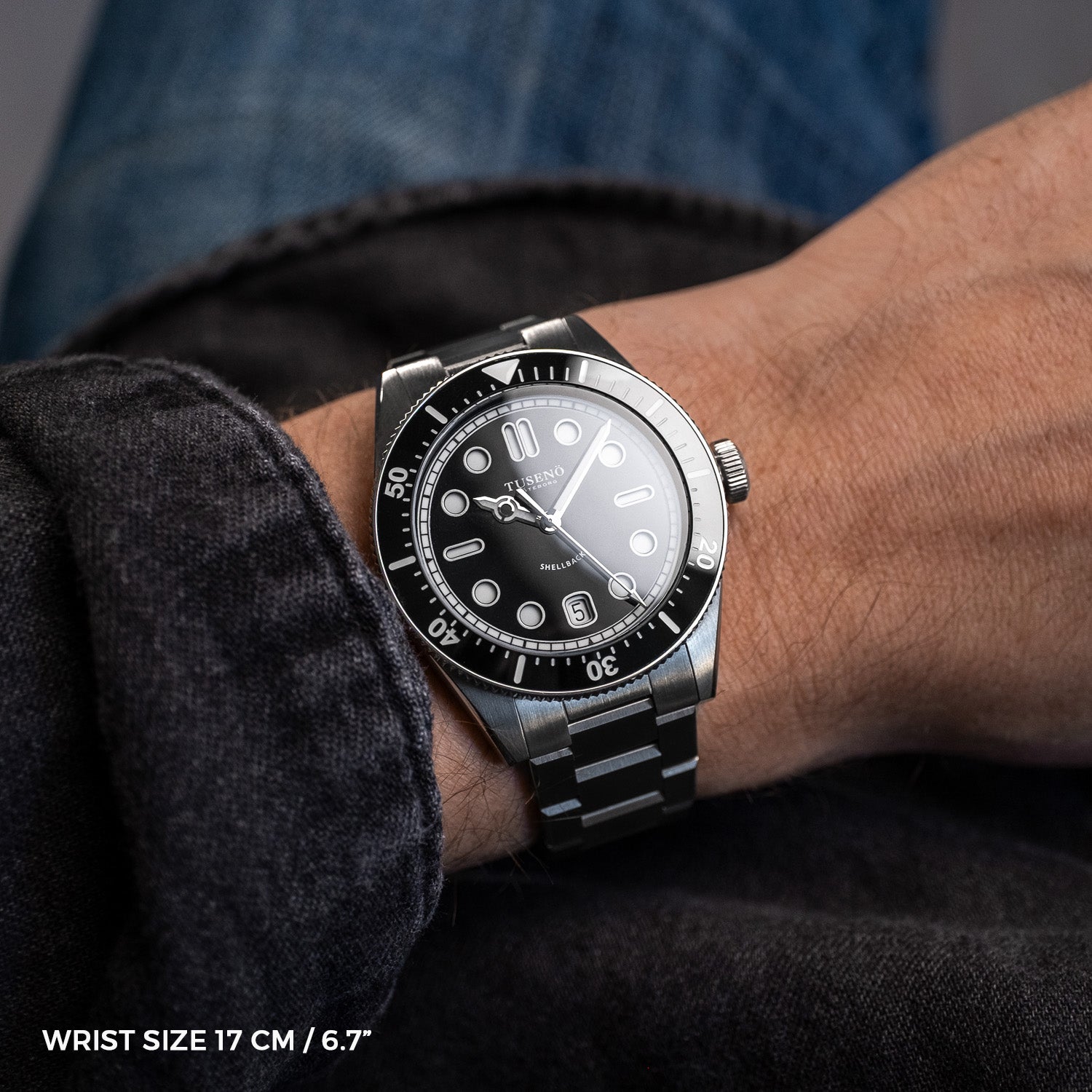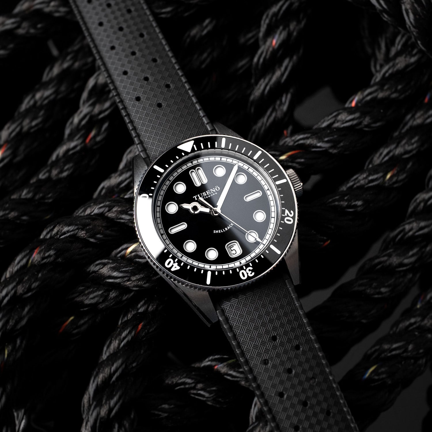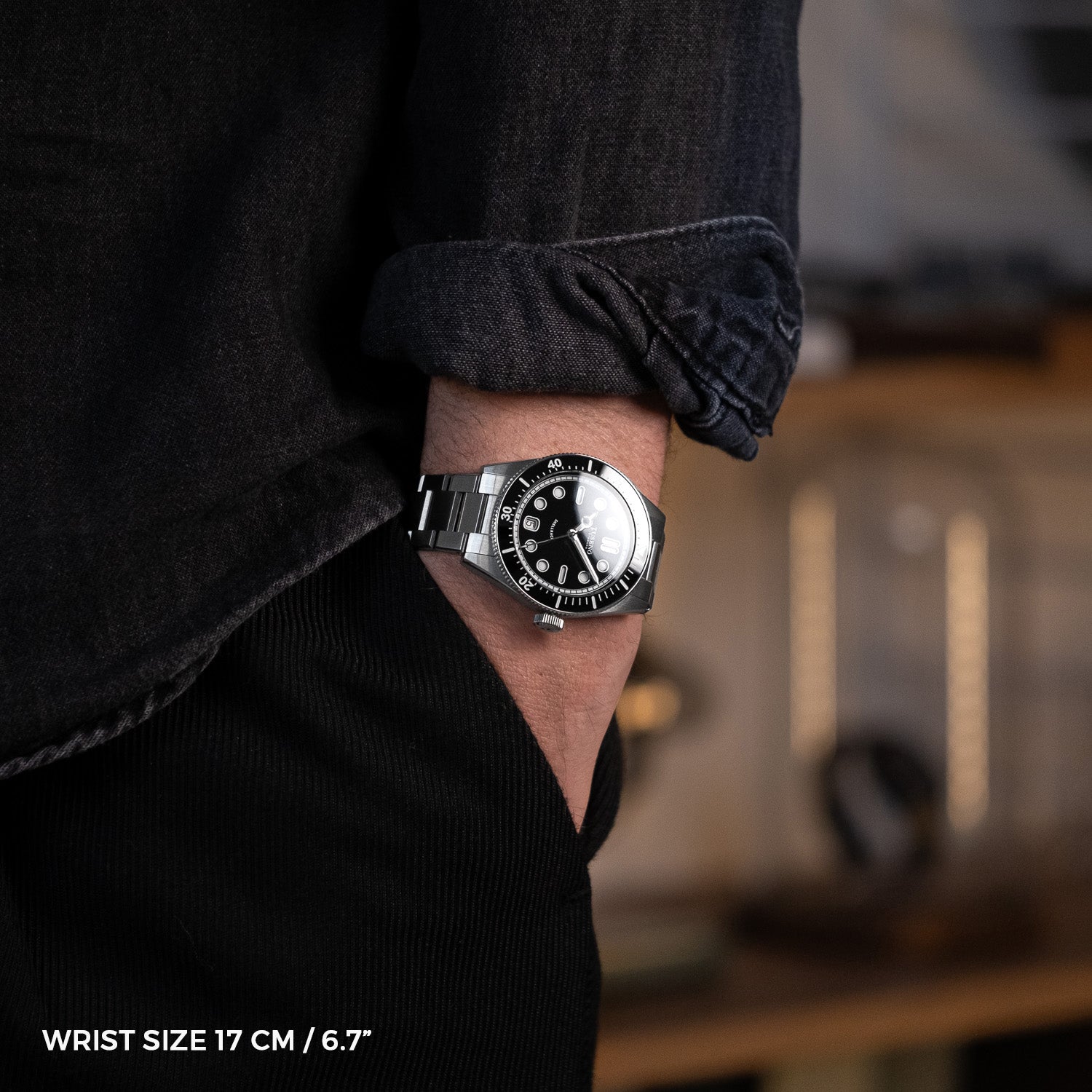 A diver watch with a pitch black enamel sandwich dial. Does the job just as good 200 meters below surface as desk diving at work.