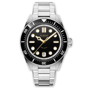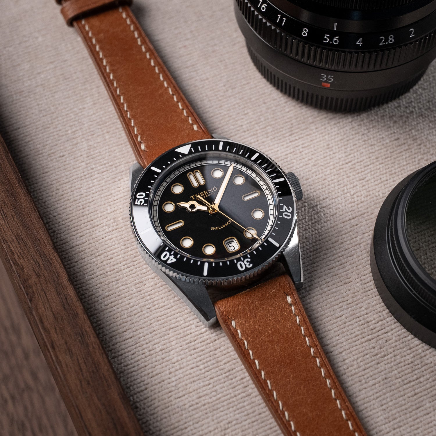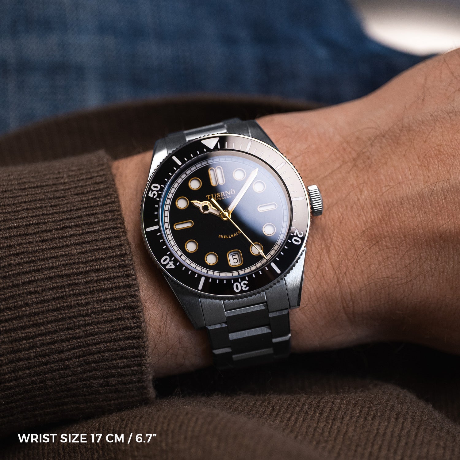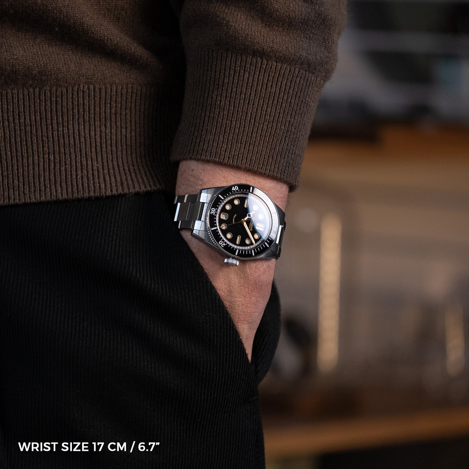 A diver watch with a pitch black enamel sandwich dial, with contrasting golden textured printing and hands, to give it a slightly vintage vibe. Does the job just as good 200 meters below surface as desk diving at work.